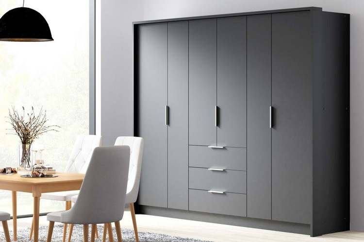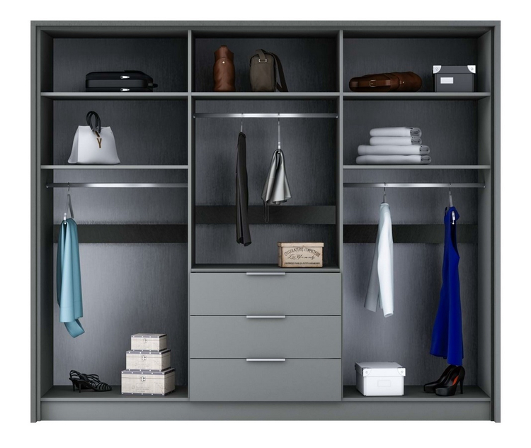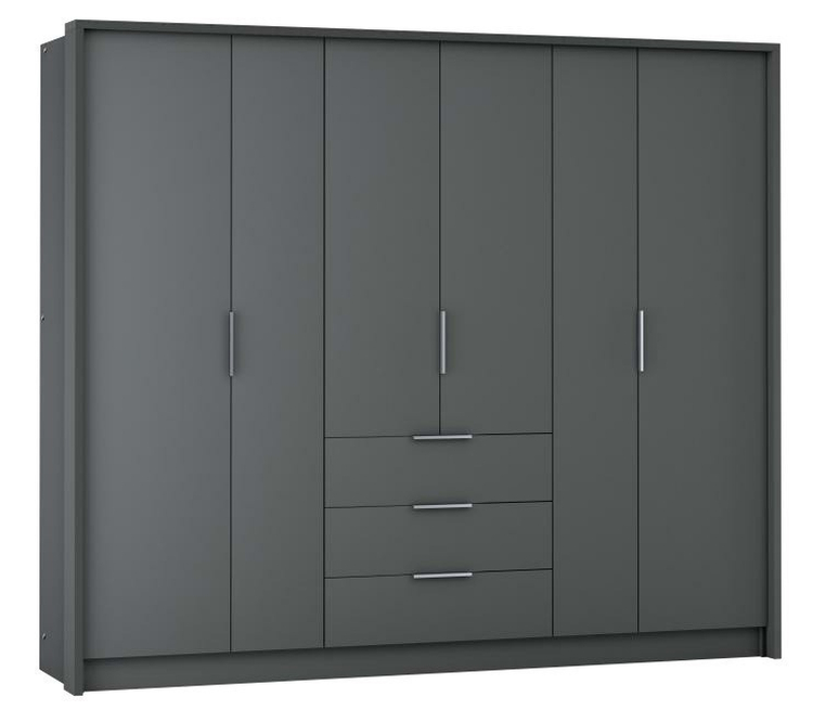 Šatní skříň třídveřová v moderním provedení. Korpus je z kvalitní LTD desky v barvě grafit. Skříň má ve středové části tři zásuvky. Uspořádání polic viz. obázek. Dodáváme v demontovaném stavu.CASA 31079