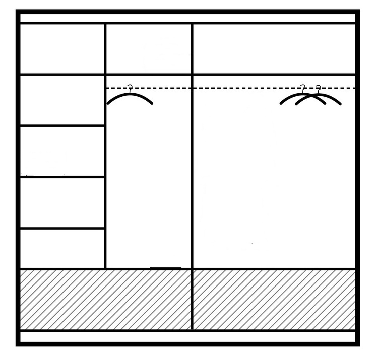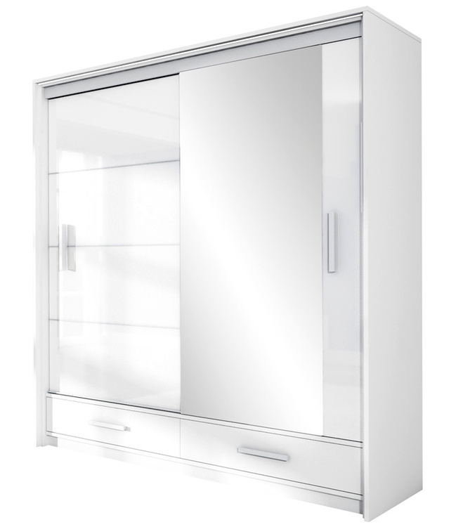 Šatní skříň s posuvnými dveřmi v moderním provedení. Korpus i dvířka jsou z kvalitního LTD v barvě bílé. Pravé dveře mají zrcadlo, levé bílý lesk. Skříň má šatní tyč a police, v dolní části skříně jsou dvě velké zásuvky Uspořádání polic viz. perokresba. Kvalitní kování Sevroll. Elegantní LED... více informací o zboží