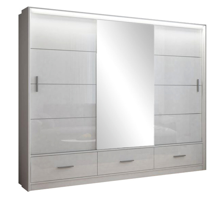 Šatní skříň s posuvnými dveřmi v moderním provedení. Korpus i dvířka jsou z kvalitního LTD v barvě bílé. Prostřední dveře mají zrcadlo, boční bílý lesk. Skříň má dvě šatní tyče a uprostřed jsou police, v dolní části skříně jsou tři velké zásuvky. Uspořádání polic viz. perokresba. Kvalitní kování Sevroll. Elegantní LED osvětlení skříně je v ceně. Dodáváme v demontovaném stavu.CASA 31033