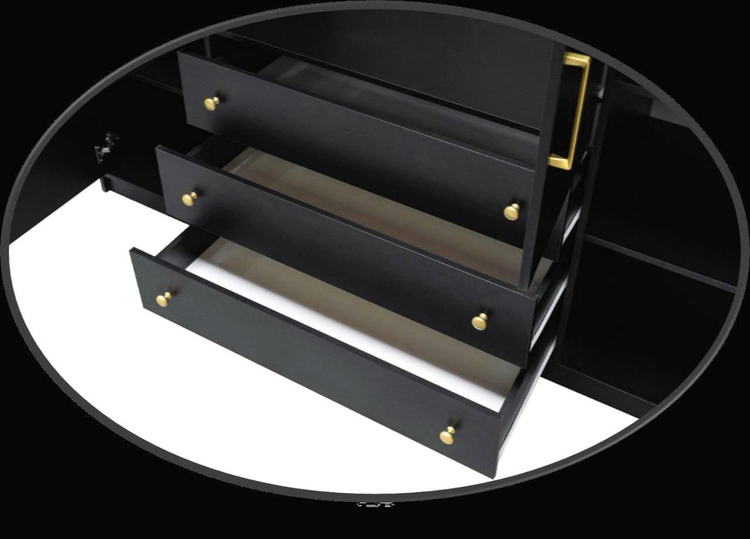 Šatní čtyřdveřová skříň se třemi zásuvkami v retro provedení potěší módní černou barvou, zlatými kovovými úchytkami a velkým úložným prostorem. Korpus i dvířka jsou z kvalitní LTD desky v černé barvě. Vnitřní uspořádání – 3 šuplíky, police a šatní tyč (viz. obrázek). Dodáváme v demontovaném stavu.CASA 31087