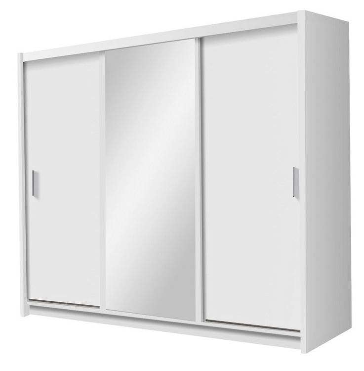 Šatní skříň s posuvnými dveřmi v moderním provedení. Korpus i dvířka jsou z kvalitního LTD a barevné provedení je bílá. Dveře obsahují praktické zrcadlo. Uspořádání polic viz. perokresba. Dodáváme v demontovaném stavu.CASA 31036