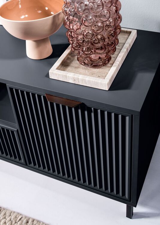 Nábytek je zdoben vzorem na čelních stranách v podobě frézovaných drážek. Všechny kusy nábytku z této kolekce stojí na černých kovových nožkách. Jednoduché a funkční tvary se hodí do obývacího pokoje, ložnice i jídelny.