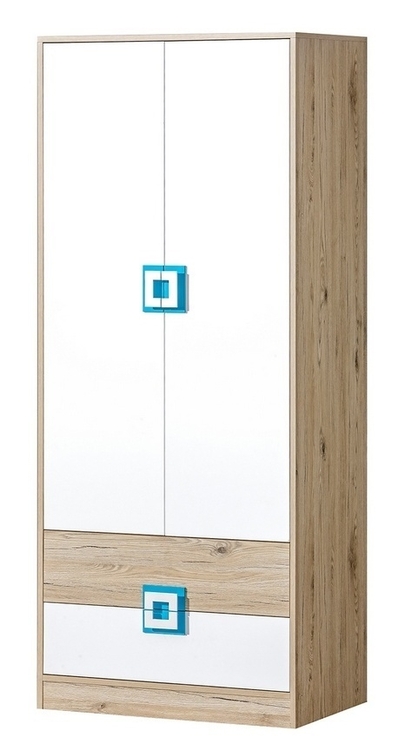 Dvoudveřová šatní skříň NIKO ze sektorové řady, která se vyznačuje netradičním zpracováním barev a originalitou úchytů. Tento styl nábytku zaujme každou mladší generaci. Skříň je vyrobena z kvalitní LTD desky hraněné ABS lištou. Korpus je v barvě dub jasný, dveře jsou v kombinaci barev bílá mat / dub jasný. Úchytky jsou v barevné kombinaci tyrkys / bílá. Uvnitř skříně je šatníková tyč, v dolní části jsou 2 zásuvky. Sektorový nábytek NIKO má široký výběr prvků, který Vám zaručí sestavit si dětský nebo studentský pokoj, ložnici či kancelář podle svých potřeb, přání a představ. Dodáváme v demontovaném stavu.CASA 23004