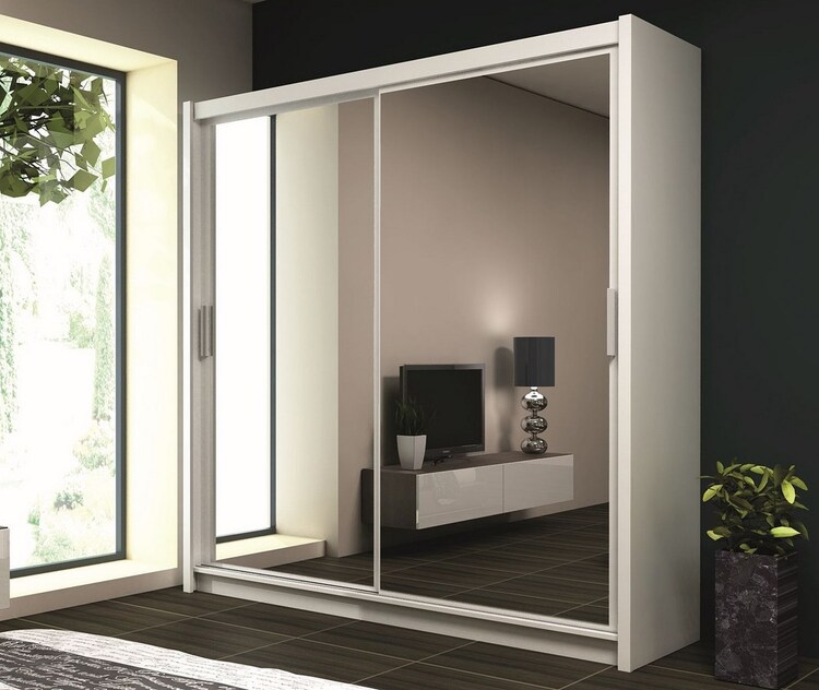 Šatní skříň s posuvnými dveřmi v moderním provedení. Korpus je z kvalitního LTD v barvě bílá. Skříň obsahuje praktické zrcadla. Uspořádání polic viz. perokresba. Dodáváme v demontovaném stavu.CASA 31040