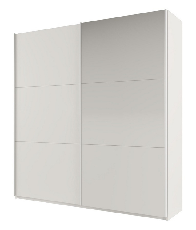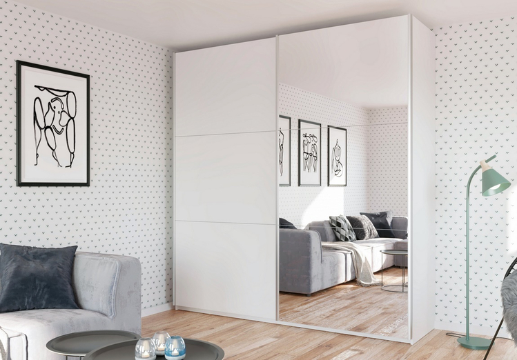 Šatní skříň s posuvnými dveřmi v jednoduchém moderním provedení. Korpus i dvířka jsou z kvalitní LTD desky v barvě bílá mat. Dveře jsou dekorovány zrcadlem. Otevírání dveří zajišťuje posuvné kování značky Häfele. Uspořádání polic viz. perokresba. Dodáváme v demontovaném stavu.CASA 31074