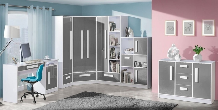 Rohová šatní skříň GULLIWER ze sektorové řady, která se vyznačuje netradičním zpracováním barev a originalitou úchytů. Tento styl nábytku zaujme každou mladší generaci. Skříň je vyrobena z kvalitní LTD desky hraněné ABS lištou. Korpus je v barvě bílá mat, dveře jsou barvě šedá lesk. Úchytky jsou v barvě bílé. Sektorový nábytek GULLIWER má široký výběr prvků, který Vám zaručí sestavit si dětský nebo studentský pokoj, ložnici či kancelář podle svých potřeb, přání a představ. Dodáváme v demontovaném stavu.CASA 23002