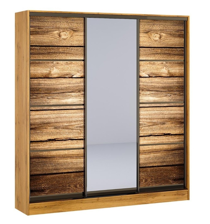 Vlastnosti: posuvný systém barvy matné champagne, materiál: korpus a dveře z kvalitní LTD desky, dveře s fotopotiskem, barevné provedení: korpus – dub Apalačský, prostřední dveře obsahují zrcadlo.