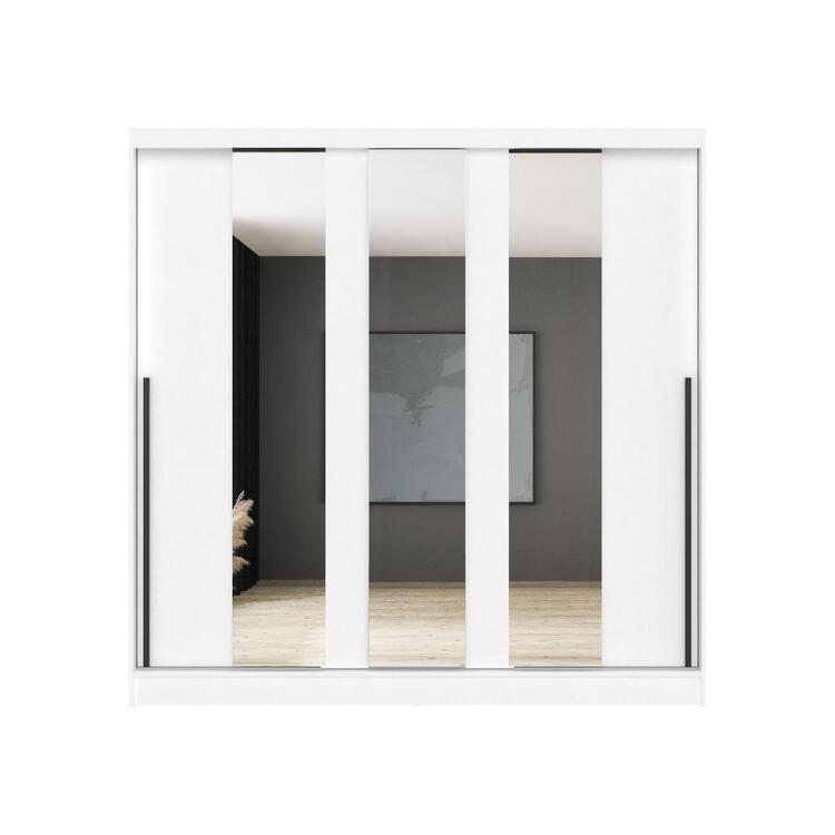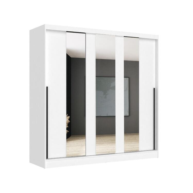 Šatní skříň se třemi posuvnými dveřmi je vyrobena z kvalitní LTD v barevném provedení bílá. Uvnitř skříně jsou dvě šatní tyče a police. Jednotlivé dveře jsou doplněny zrcadly. Lamino je odolné vůči vysokým teplotám a poškrábání. Dodáváme v demontovaném stavu.CASA 85018