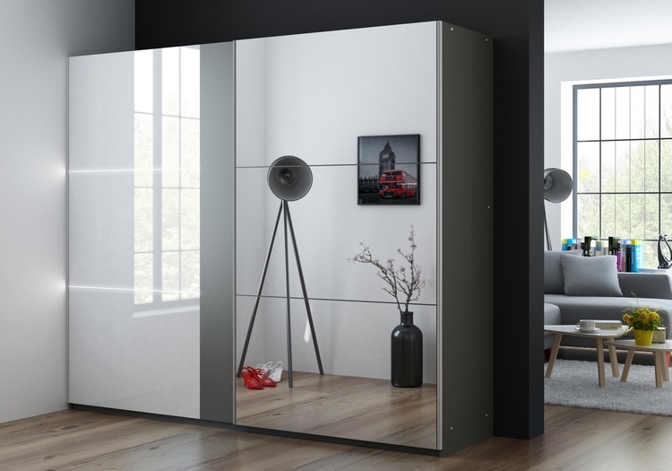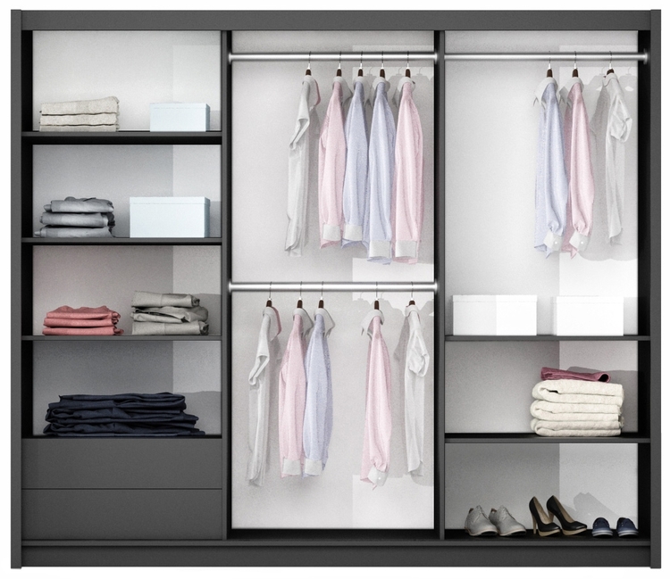Šatní skříň s posuvnými dveřmi v moderním provedení vhodná do monochromatického interiéru. Korpus je z kvalitní LTD desky grafitové barvy. Dveře jsou v barevné kombinaci grafit/bílý lesk doplněné zrcadlem. Skříň obsahuje praktické LED pásky ve dveřích v ceně. Uspořádání polic viz. obrázek.... více informací o zboží
