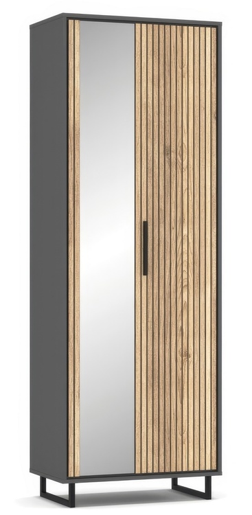 Šatní skříň dvoudveřová v industriálním stylu je vyrobena z LTD desky, korpus je v barvě šedé, přední část dveří je doplněna lištami z přírodního dubového dřeva a také zrcadlem. Uvnitř skříně jsou police a držák na věšáky. Nohy jsou kovové černé. Nábytek disponuje teleskopickými pojezdy a... více informací o zboží