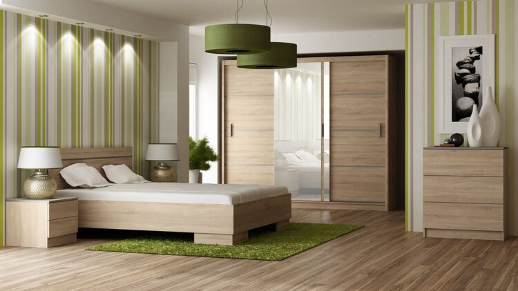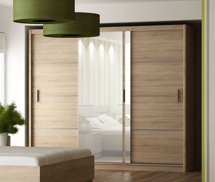 Šatní skříň s posuvnými dveřmi v moderním provedení. Korpus i dvířka jsou z kvalitního LTD a barevné provedení je dub sonoma. Skříň obsahuje praktické zrcadlo. Uspořádání polic viz. perokresba. Dodáváme v demontovaném stavu.CASA 31058