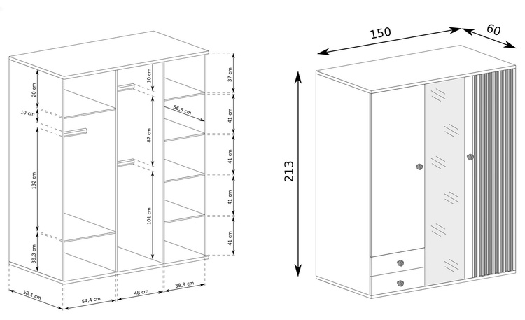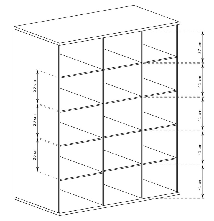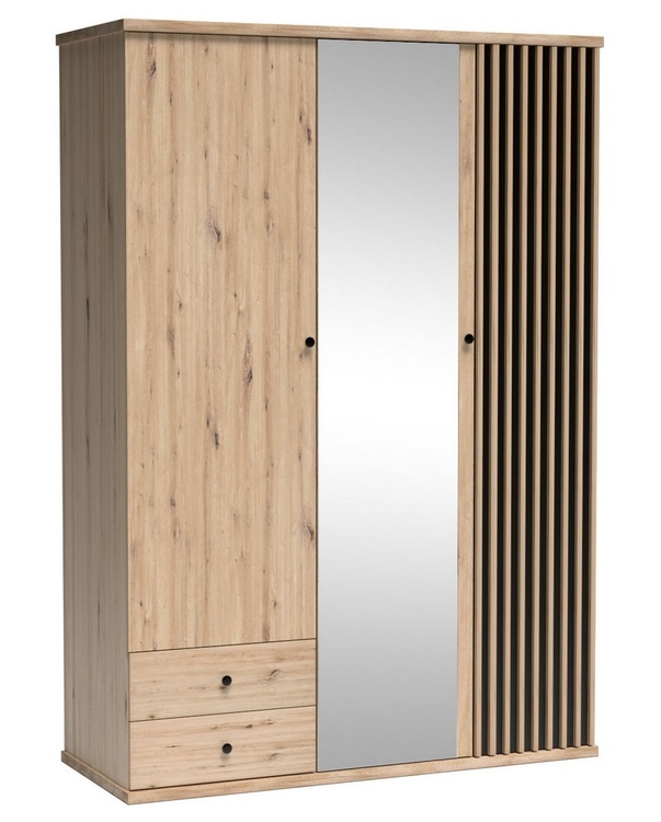 Šatní skříň s třídveřová s netradičním provedením detailu dvířek s lamelami. Kolekce nábytku v sobě spojuje jednoduchost, originální vzhled a funkčnost. Barevné provedení je v kombinaci dub artisan/černá mat. Nábytek je vyroben z kvalitního lamina ohraničeného ABS páskou, dekorační lamely jsou vyrobeny z desky MDF. Uvnitř skříně viz obrázek, Možnost dokoupit další police. Skříň obsahuje zrcadlo. Kolekce se skládá z mnoha prvků a tento široký výběr Vám zaručí sestavit si nábytek podle svých vlastních představ a přání. Dodáváme v demontovaném stavu.