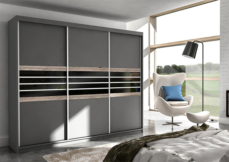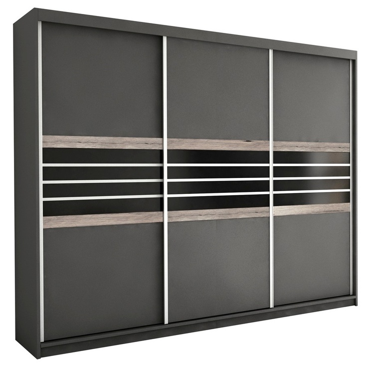 Šatní skříň s posuvnými dveřmi v moderním provedení. Korpus i dvířka jsou z kvalitního LTD v barvě láva. Uprostřed dveří je aplikace z černého skla. Skříň má šatní tyč, police a 2 zásuvky. Uspořádání polic viz. perokresba. Posuvné dveře jsou postavené na velmi kvalitních hliníkových... více informací o zboží