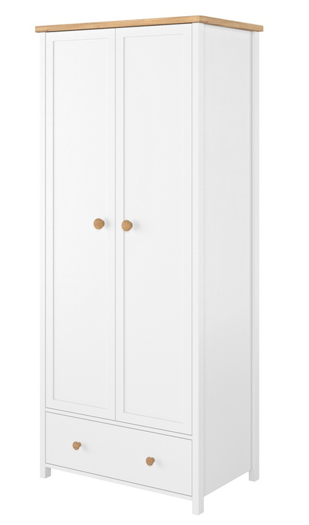 Dvoudveřová šatní skříň. Tento elegantní nábytek dodá romantickou atmosféru pokojíčku malé princezny i větší slečny. Skříň je vyrobena z desky LTD v kombinaci s MDF v barvě bílé s doplňkovou barvou dub Nash ( 22 mm ). Uvnitř skříně je šatní tyč. Ve spodní části je prostorná zásuvka. Úchyty jsou plastové v barvě dub Nash. Dodáváme v demontovaném stavu.CASA 73015