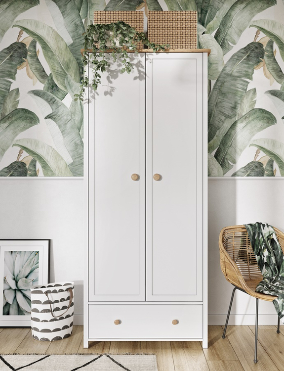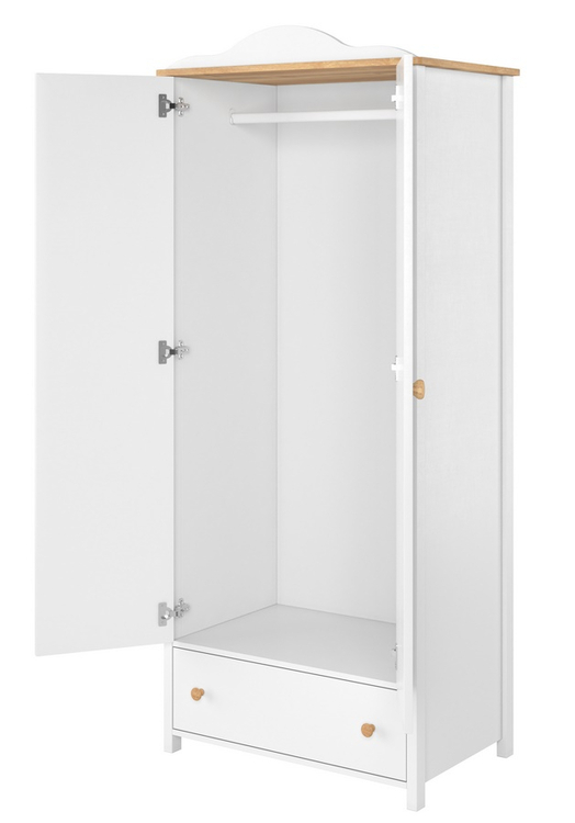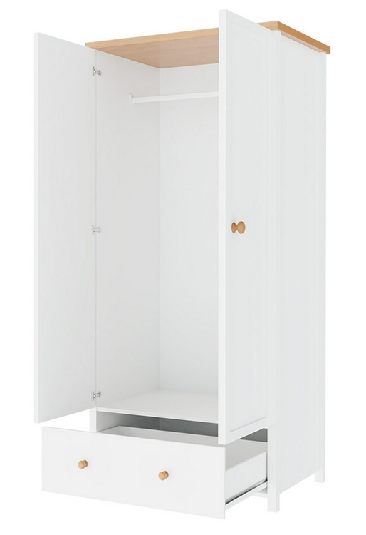 Dvoudveřová šatní skříň. Tento elegantní nábytek dodá romantickou atmosféru pokojíčku malé princezny i větší slečny. Skříň je vyrobena z desky LTD v kombinaci s MDF v barvě bílé s doplňkovou barvou dub Nash ( 22 mm ). Uvnitř skříně je šatní tyč. Ve spodní části je prostorná zásuvka. Úchyty... více informací o zboží