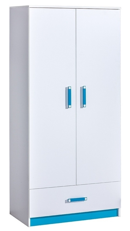 Dvoudveřová šatní skříň TRAFICO ze sektorové řady, která se vyznačuje netradičním zpracováním barev a originalitou úchytů. Tento styl nábytku zaujme každou mladší generaci. Skříň je vyrobena z kvalitní LTD desky hraněné ABS lištou. Korpus i dveře jsou v bílé matné barvě doplněné barvou tyrkys. Uvnitř skříně je šatníková tyč a police, v dolní části je zásuvka. Sektorový nábytek TRAFICO má široký výběr prvků, který Vám zaručí sestavit si dětský nebo studentský pokoj, ložnici či kancelář podle svých potřeb, přání a představ. Dodáváme v demontovaném stavu.CASA 23005