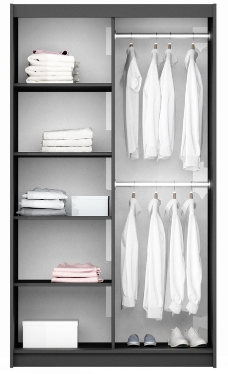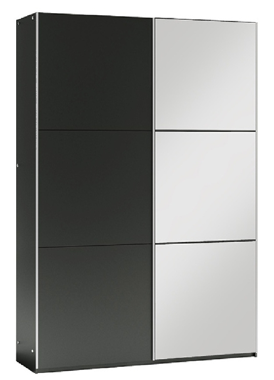 Šatní skříň s posuvnými dveřmi v moderním provedení vhodná do monochromatického interiéru. Korpus i dvířka jsou z kvalitní LTD desky černé barvy. Dveře jsou v barvě černé doplněné zrcadlem. Uspořádání polic viz. obrázek. Dodáváme v demontovaném stavu.CASA 31057