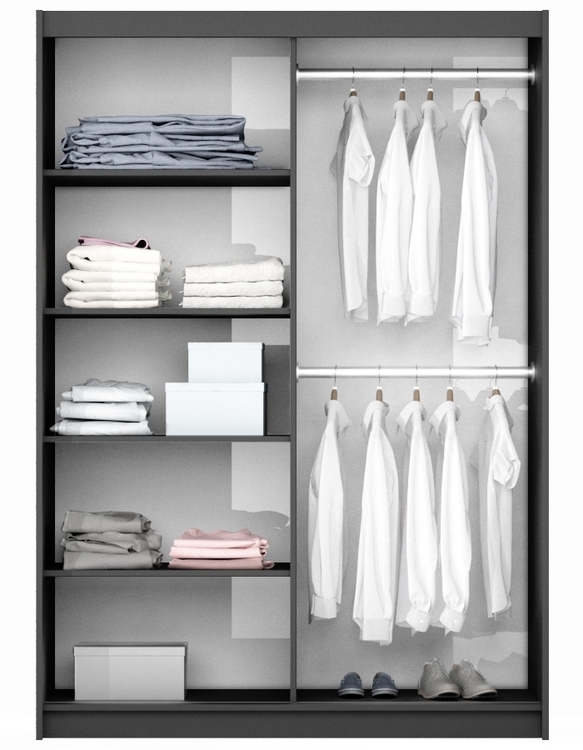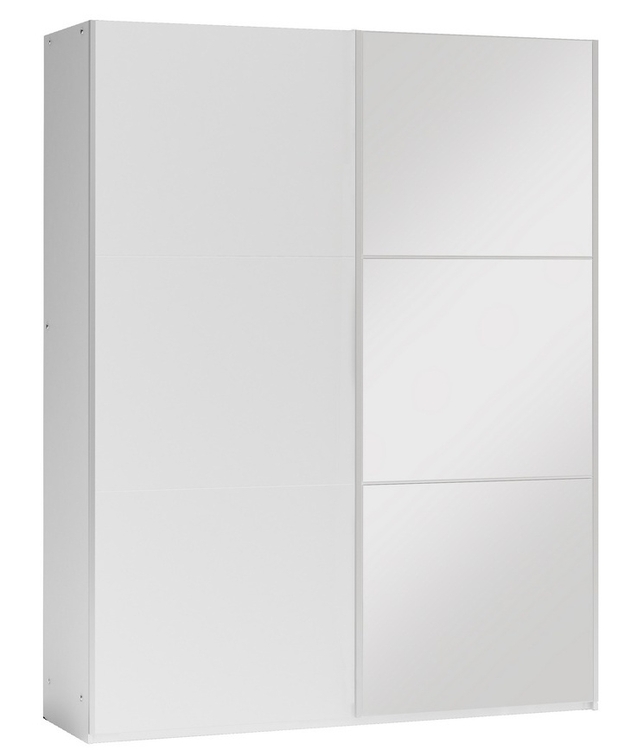 Šatní skříň s posuvnými dveřmi v moderním provedení vhodná do monochromatického interiéru. Korpus i dvířka jsou z kvalitní LTD desky bílé barvy. Dveře jsou v barvě bílé doplněné zrcadlem. Uspořádání polic viz. obrázek. Dodáváme v demontovaném stavu.CASA 31057