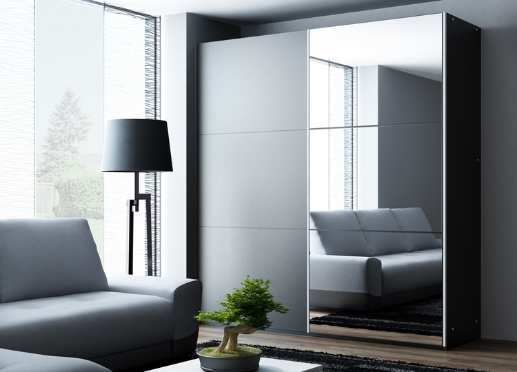 Šatní skříň s posuvnými dveřmi v moderním provedení vhodná do monochromatického interiéru. Korpus i dvířka jsou z kvalitní LTD desky černé barvy. Dveře jsou v barvě černé doplněné zrcadlem. Uspořádání polic viz. obrázek. Dodáváme v demontovaném stavu.CASA 31057