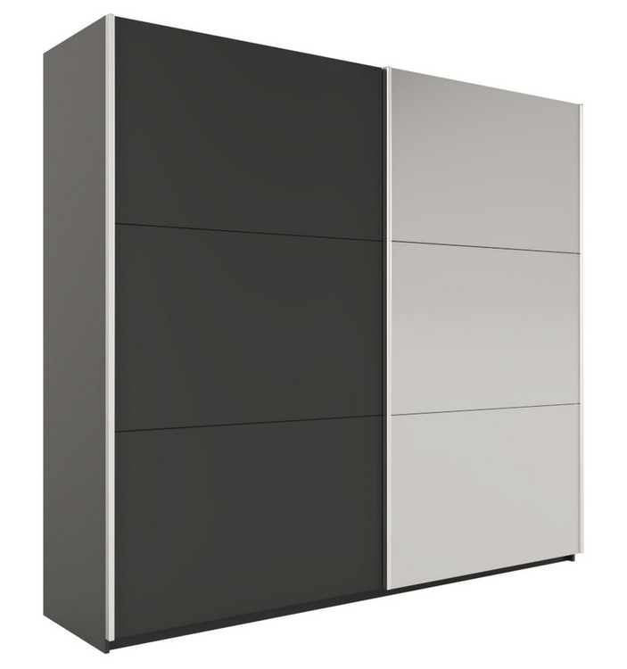 Šatní skříň s posuvnými dveřmi v moderním provedení vhodná do monochromatického interiéru. Korpus i dvířka jsou z kvalitní LTD desky černé barvy. Dveře jsou v barvě černé doplněné zrcadlem. Uspořádání polic viz. obrázek. Dodáváme v demontovaném stavu.CASA 31057