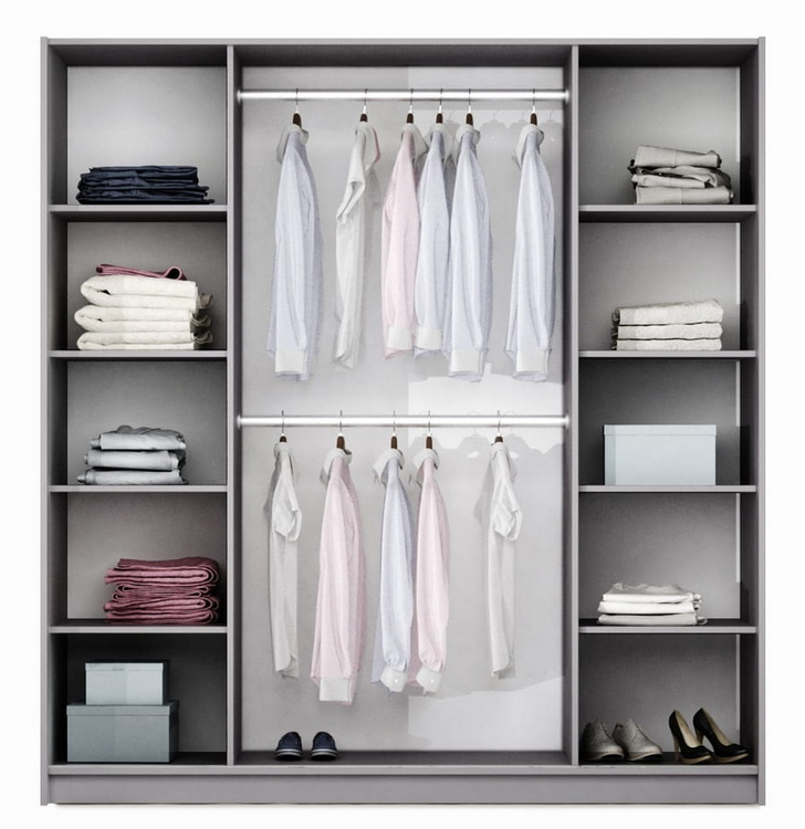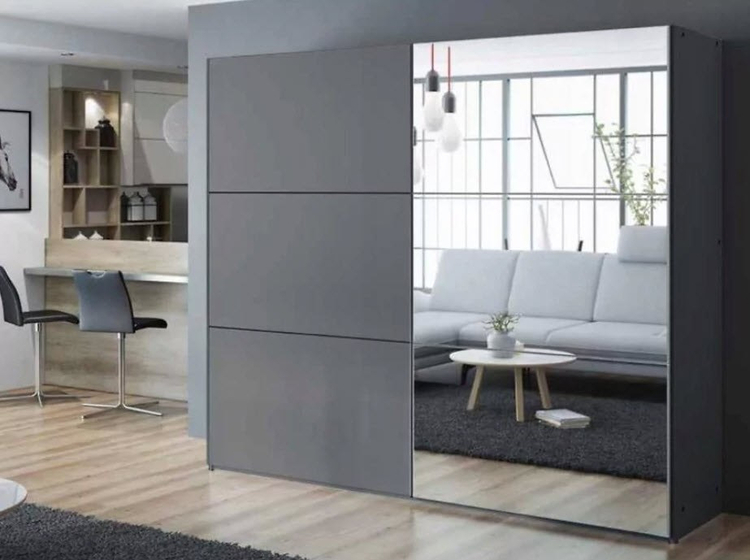 Šatní skříň s posuvnými dveřmi v moderním provedení vhodná do monochromatického interiéru. Korpus i dvířka jsou z kvalitní LTD desky grafitové barvy. Dveře jsou v barvě grafitové doplněné zrcadlem. Uspořádání polic viz. obrázek. Dodáváme v demontovaném stavu.CASA 31057