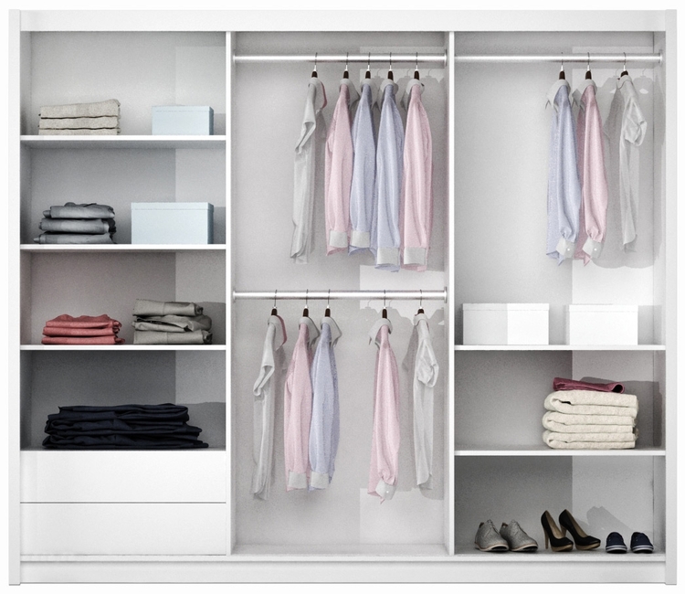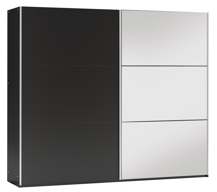 Šatní skříň s posuvnými dveřmi v moderním provedení vhodná do monochromatického interiéru. Korpus i dvířka jsou z kvalitní LTD desky černé barvy. Dveře jsou v barvě černé doplněné zrcadlem. Uspořádání polic viz. obrázek. Dodáváme v demontovaném stavu.CASA 31057