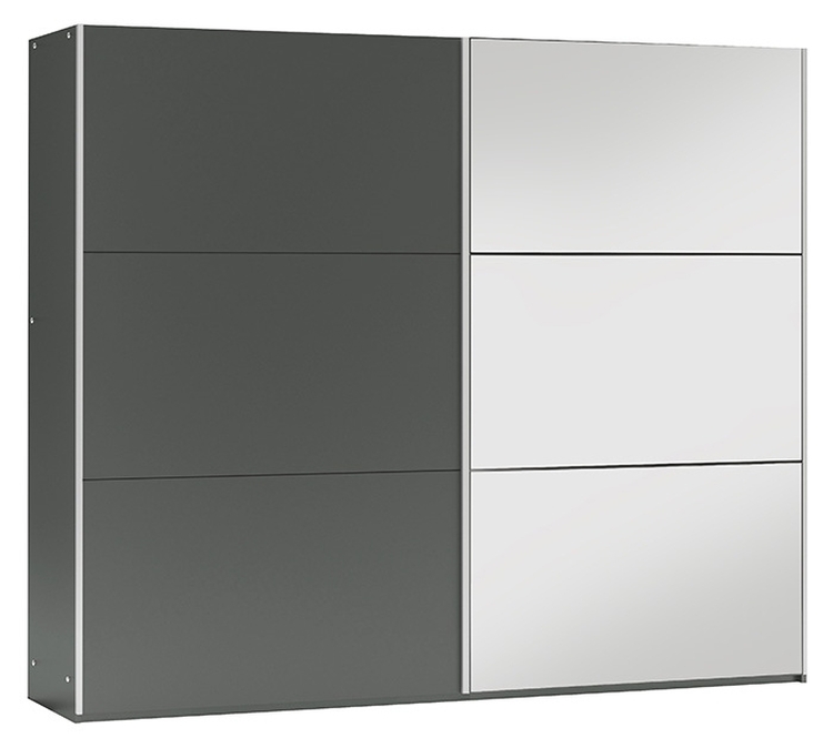 Šatní skříň s posuvnými dveřmi v moderním provedení vhodná do monochromatického interiéru. Korpus i dvířka jsou z kvalitní LTD desky grafitové barvy. Dveře jsou v barvě grafitové doplněné zrcadlem. Uspořádání polic viz. obrázek. Dodáváme v demontovaném stavu.CASA 31057