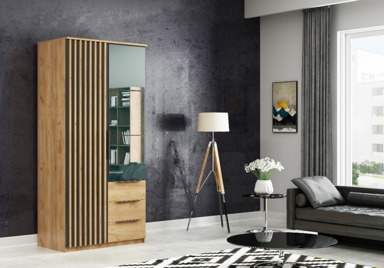 Šatní skříň dvoudveřová se třemi zásuvkami v moderním provedení. Korpus i dvířka jsou z kvalitní LTD desky v kombinaci barev dub kraft zlatý/černá doplněné zrcadlem. Uspořádání polic viz. obrázek. Úchyty jsou kovové. Dodáváme v demontovaném stavu.CASA 38018