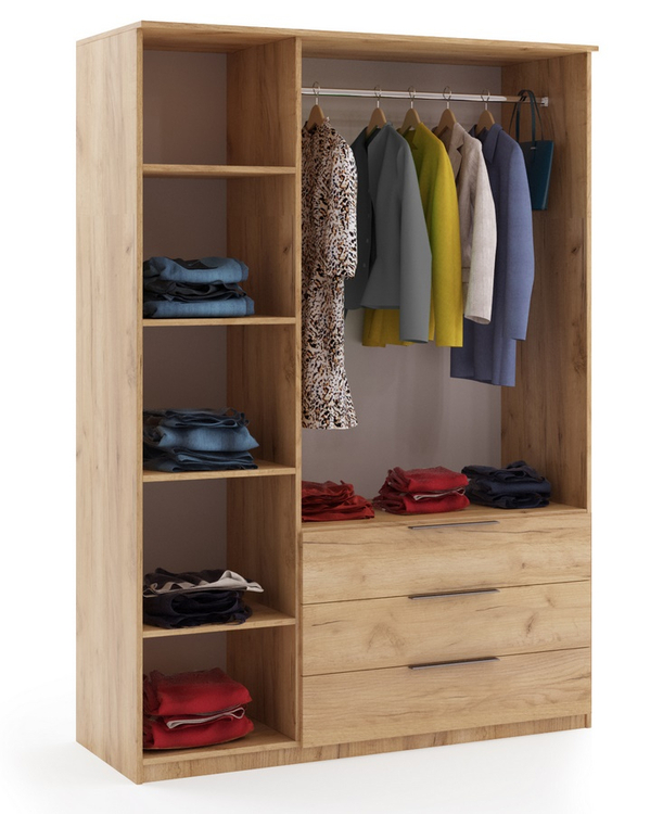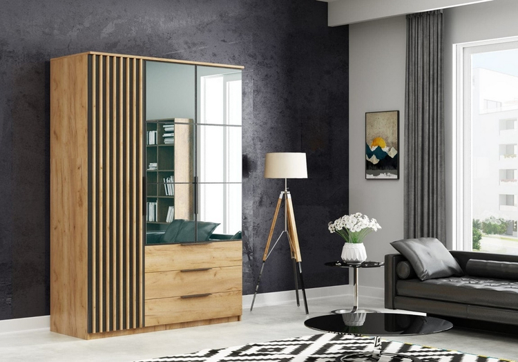 Šatní skříň třídveřová se třemi zásuvkami v moderním provedení. Korpus i dvířka jsou z kvalitní LTD desky v kombinaci barev dub kraft zlatý/černá doplněné zrcadlem. Uspořádání polic viz. obrázek. Úchyty jsou kovové. Dodáváme v demontovaném stavu.CASA 38018