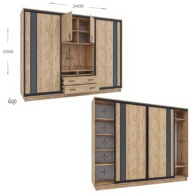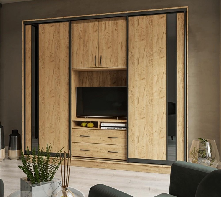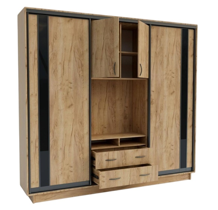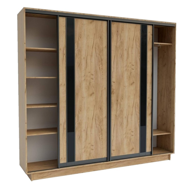 Obývací stěna/šatní skříň s posuvnými dveřmi v moderním a vyjimečném provedení. Je vhodná jak do ložnice, tak do obývacího pokoje pro efektivní využití prostoru. Nezvyklá výška 220 cm a šířka 240 cm Vám nabídne opravdu velký úložný prostor. Skříň navíc v prostřední části nabízí v celku obyvací stěnu – prostor pro TV, pak má praktickou vrchní dvoudveřovou skříňku a ve spodní části dvě prostorné zásuvky. Rozměry na obrázku. Barevné provedení je dub zlatý craft, dvířka jsou dekorovány pásy v černé matné barvy. Dodáváme v demontovaném stavu.