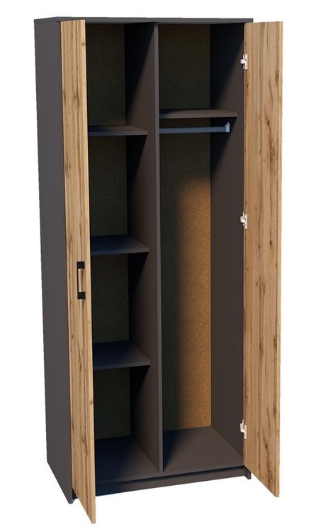 Šatní skříň v jednoduchém, ale velmi praktickém provedení a moderním designu. Korpus i dvířka jsou z kvalitní LTD. Korpus je v barvě grafit, dvířka v barvě dub wotan. Lamino je odolné vůči vysokým teplotám, poškrábání a nárazům, hraněné ABS páskou. Jasně viditelná struktura dřeva. Dodáváme v demontovaném stavu.CASA 53017