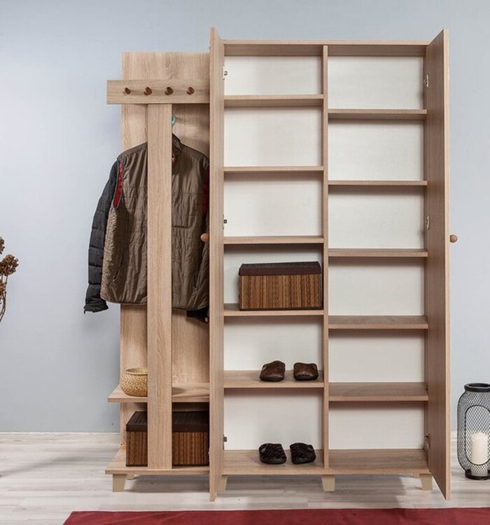 Sestava poskytuje dostatek prostoru pro organizaci vaší předsíně. Praktická skříň nabízí místo na oblečení a doplňky, zatímco věšák umožňuje snadné zavěšení kabátů či tašek. Design s kovovými a provazovými úchytkami dodává sestavě jedinečný vzhled.