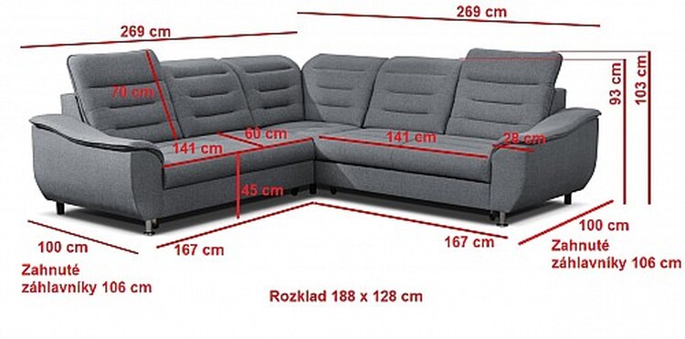 Sedací souprava BALBORA je široká 269, dlouhá 269 a vysoká mezi 93 a103 centimetry. Pokud sedací soupravu BALBORA rozložíte, získáte lůžkos ložnou plochou 128 × 188 centimetrů.