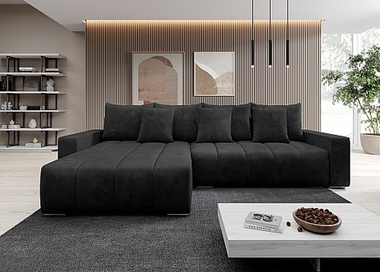 Sedací souprava CASTELLO (AKCE) – rohová, rozkládací s úložnýmprostorem. Čtyři velké zádové polštáře + 3 malé dekorativnípolštáře jsou v ceně.