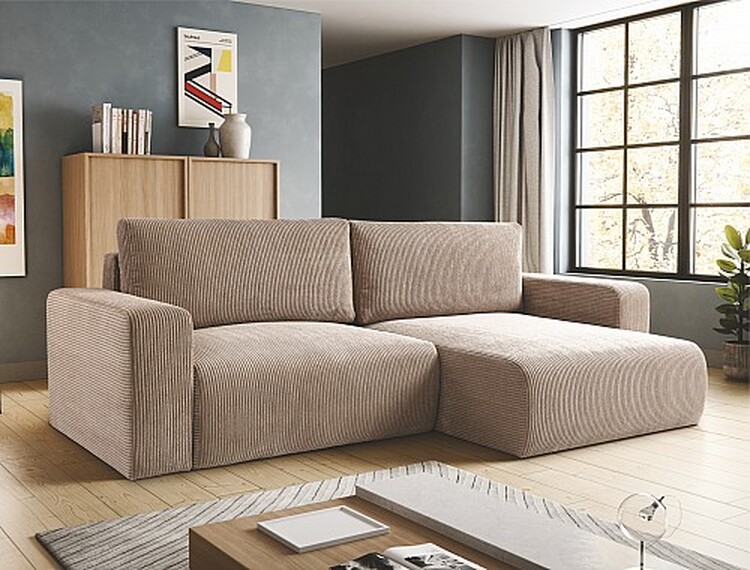 Sedací souprava je univerzální – jeden kus lze smontovat jako pravoui levou variantu.