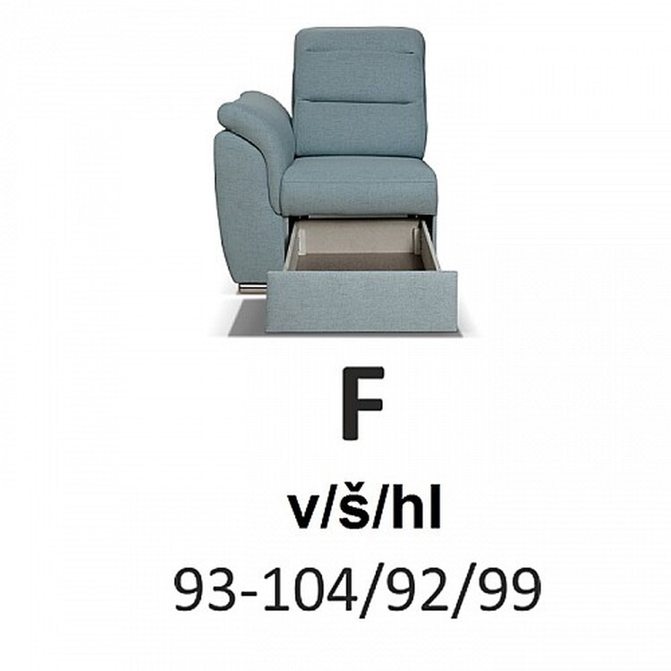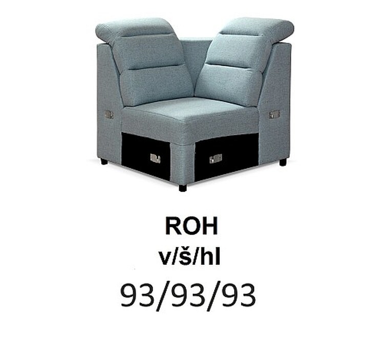 Sedací souprava má polohovatelné opěrky hlavy – záhlavníky, jerozkládací, s úložným prostorem. V sedáku je sendvičová pěna navlnovci. Chromové nohy o výšce 5 cm.