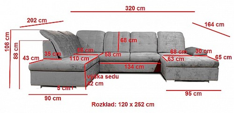 S rozměry 320 × 202 × 103 cm a hloubkou 164 cm poskytuje