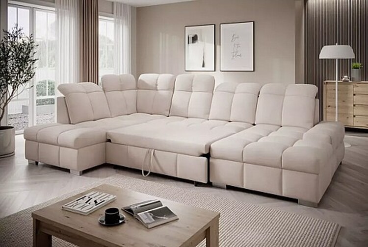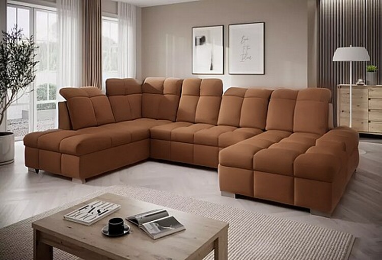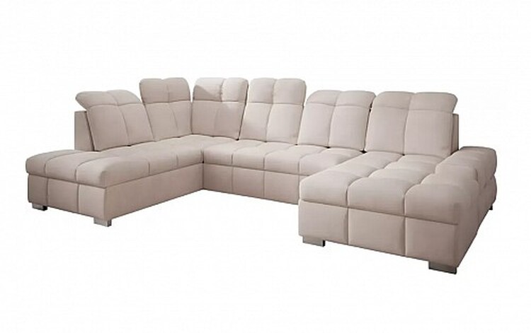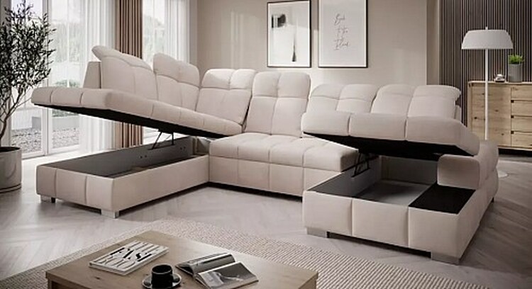 Sedací souprava PRESTIGE „U“ – rozkládací se 2 úložnýmiprostory. Regulovatelné opěrky hlavy – zahlavníky.