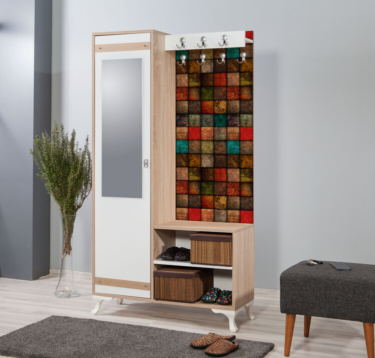 Předsíňová sestava nabízí kombinaci praktických prvků a estetického designu. Skříň se zrcadlem nejenže poskytuje úložný prostor na vaše oblečení a doplňky, ale zrcadlo zároveň opticky zvětší prostor a usnadní kontrolu vašeho vzhledu před odchodem. Věšák umožňuje snadné zavěšení kabátů, tašek nebo klobouků.