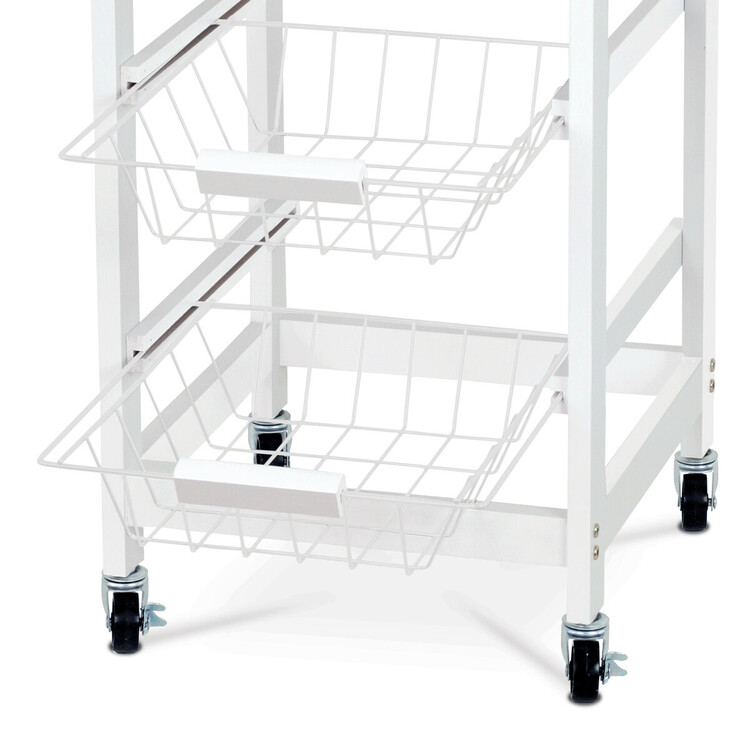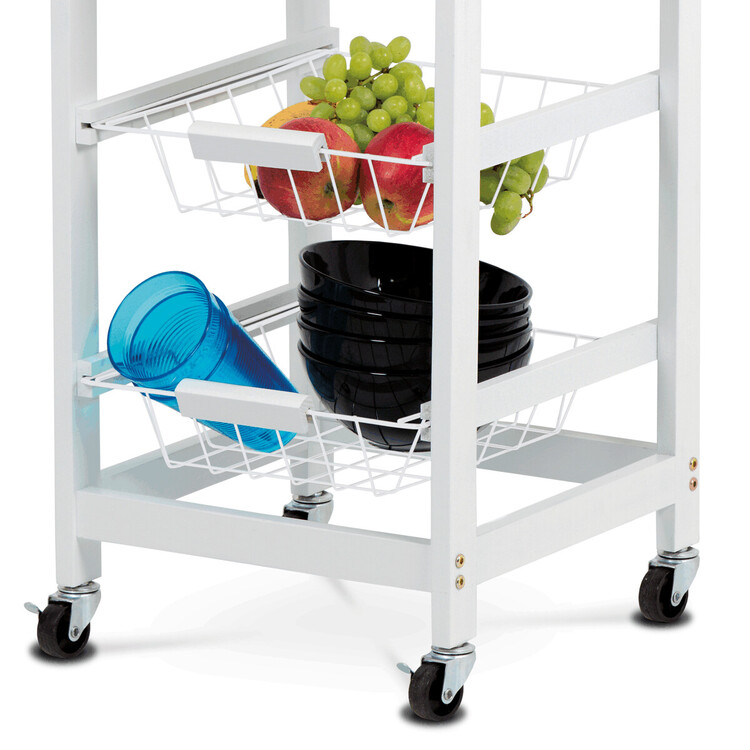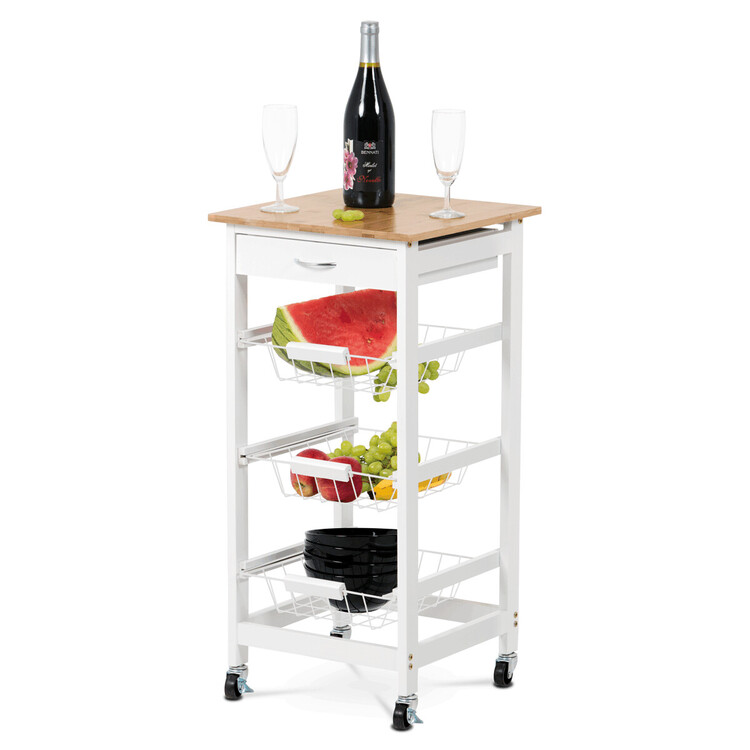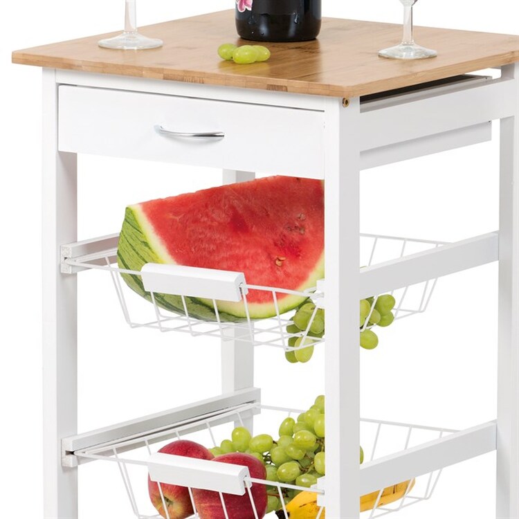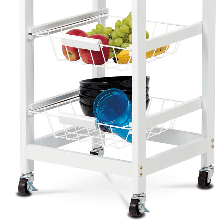 Servírovací stolek a regál je vyrobený z MDF s matným bílým lakem a masivní bambusovou deskou v přírodním dekoru, která dodává výrobku příjemný a teplý vzhled. Konstrukce je doplněna třemi kovovými drátěnými koši, které jsou praktické pro uskladnění ovoce, zeleniny nebo kuchyňských doplňků.... více informací o zboží
