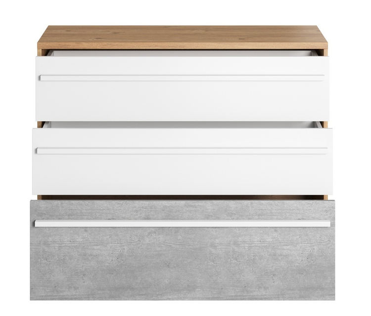 Sestava dětského pokoje v moderním stylu. Korpus je vyroben z desky LTD v barvě dub nash, dvířka a zásuvky jsou vyrobeny z desky LTD v kombinaci barev šedá/bílá. Sestava se skládá z těchto komponentů (Š x V x H cm) – skříň třídveřová (150 × 191 × 51 cm),pracovní stůl (120 × 76 × 55 cm),komoda se zásuvkami (110 × 88 × 41 cm) a postel se zásuvkami (127 × 86 × 211 cm). Součástí postele je rošt, matraci je nutno dokoupit, vhodný rozměr matrace je 120×200 cm. Dodáváme v demontovaném stavu.CASA 73034