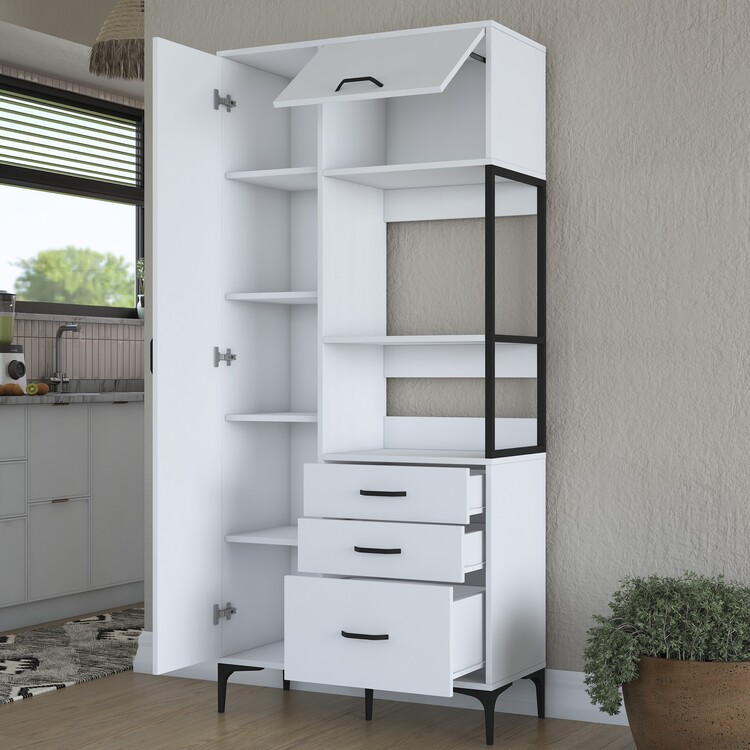 Policová skříň je elegantním a víceúčelovým řešením pro vaši kuchyni. Díky vysoké konstrukci, čistě bílému designu a skandinávskému stylu přináší moderní vzhled a dostatek úložného prostoru pro všechny vaše potřeby. Je ideální pro uložení kuchyňského náčiní, potravin nebo dalších předmětů, které potřebujete mít na dosah.