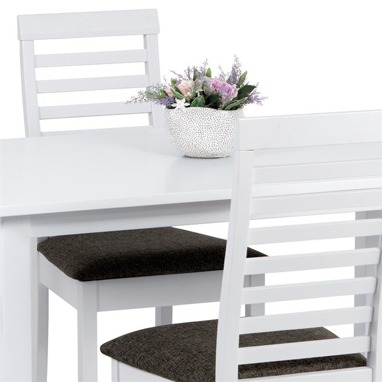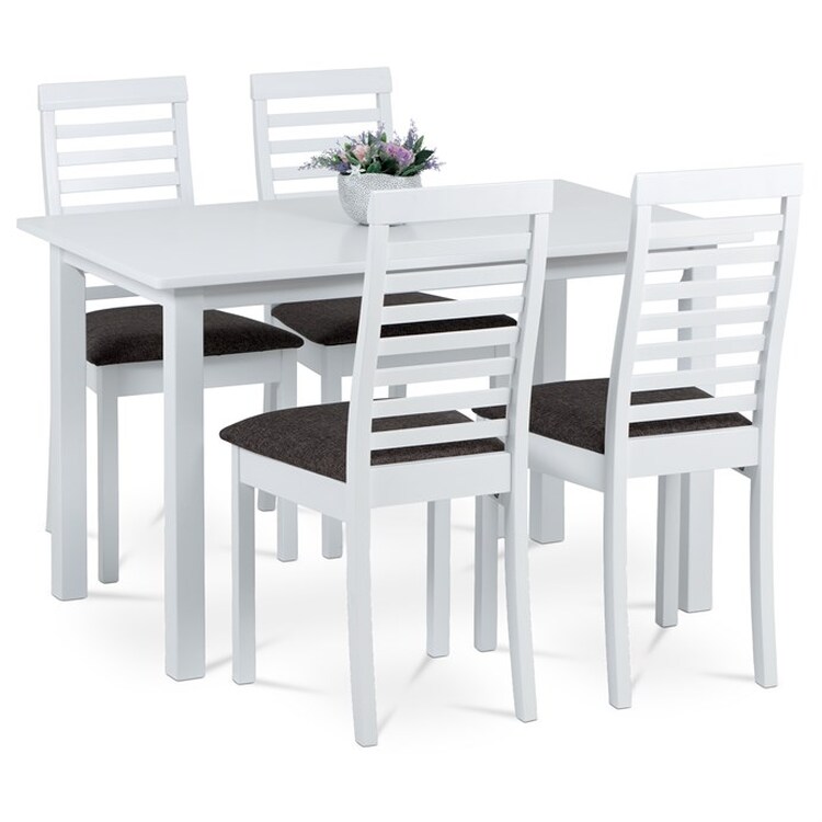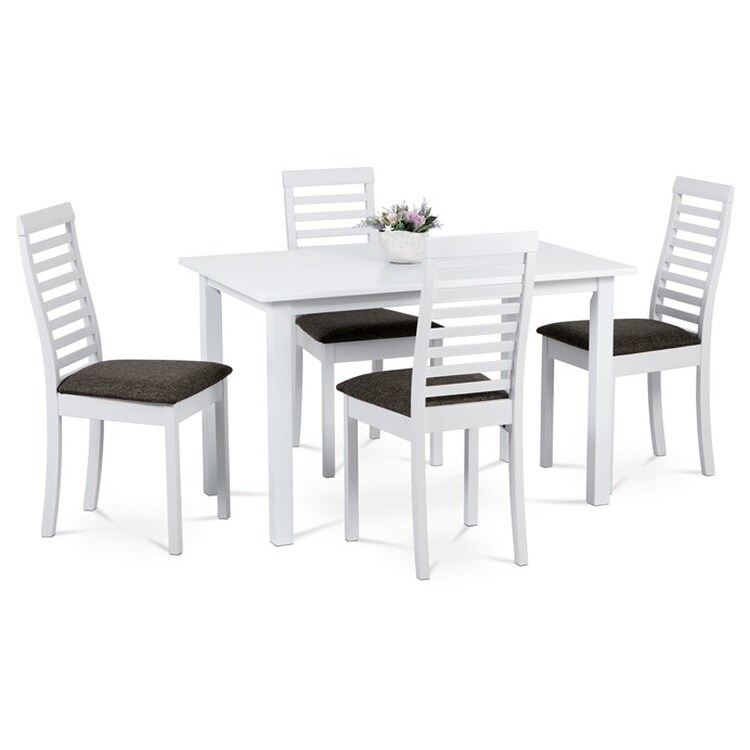 Jídelní set 1+4 v bílé matné úpravě je vyroben z masivního dřeva, které zajišťuje pevnost a stabilitu celého setu. Stůl o rozměrech 120×75×75 cm nabízí dostatek prostoru pro pohodlné stolování až pro čtyři osoby. Masivní nohy stolu i židlí přispívají k dlouhé životnosti a odolnosti proti běžnému opotřebení. Židle mají ergonomicky tvarovaná opěradla s vodorovnými příčkami a čalouněné sedáky v tmavém odstínu, které zvyšují komfort při sezení. Celkový design je jednoduchý a nadčasový, vhodný do různých typů interiérů, kde oceníte kvalitní materiály a precizní zpracování.