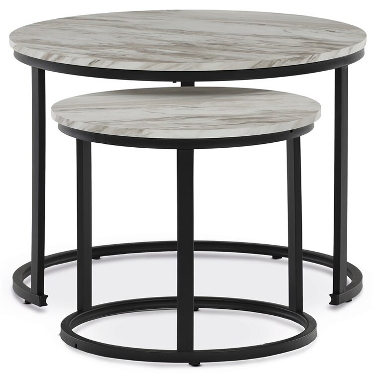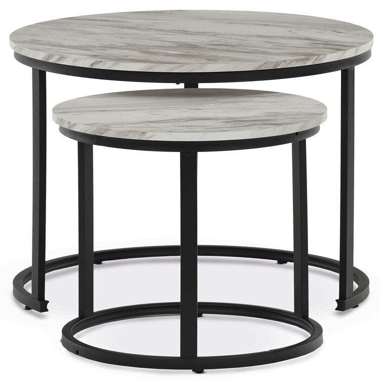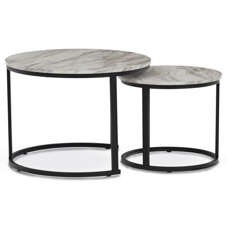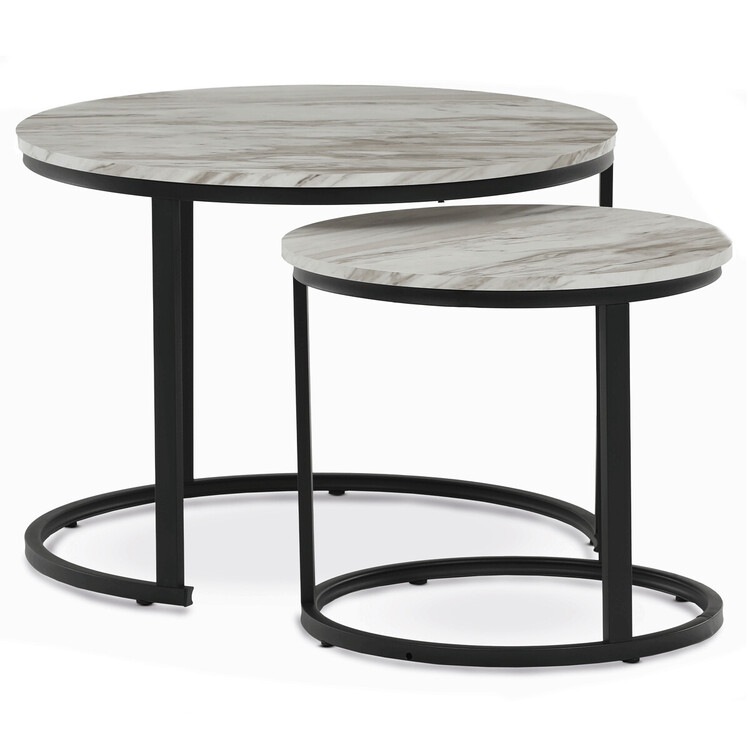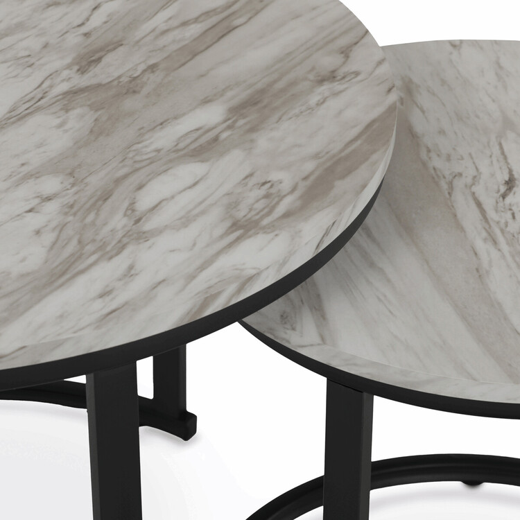 Set dvou konferenčních stolků s deskami z MDF v dekoru bílého mramoru nabízí moderní a praktické řešení pro obývací pokoj. Desky jsou opatřeny matnou povrchovou úpravou, která usnadňuje údržbu a zachovává přirozený vzhled mramorového dekoru. Podnože jsou vyrobeny z pevného kovu s černým lakem, který zajišťuje stabilitu a dlouhou životnost. Menší stolek lze zasunout pod větší, což umožňuje flexibilní využití prostoru. Výška většího stolku je 50 cm, což je ideální rozměr pro pohodlné odkládání nápojů či dekorací.