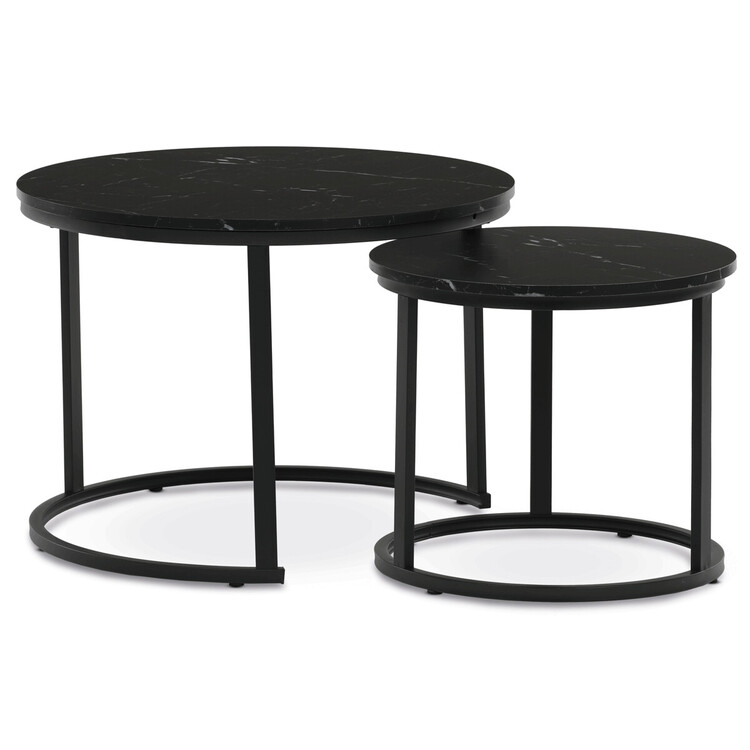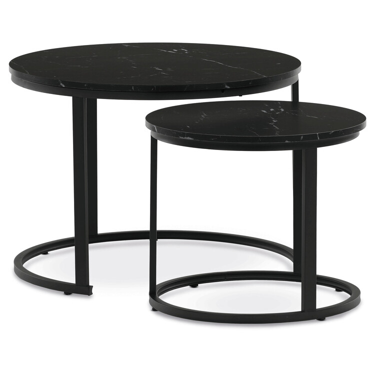 Set dvou konferenčních stolků s deskami z MDF v dekoru černého mramoru a matnou povrchovou úpravou nabízí moderní řešení pro obývací pokoj či kancelář. Kovová podnož v černém laku zajišťuje pevnou a stabilní oporu, zatímco kulatý tvar stolů přispívá k elegantnímu a vzdušnému vzhledu. Větší... více informací o zboží