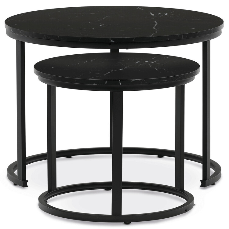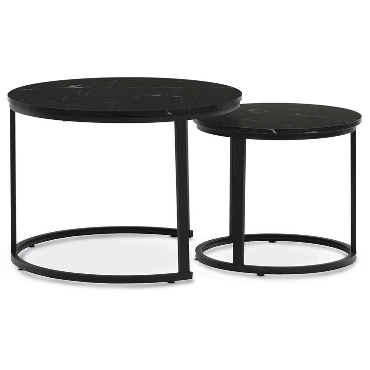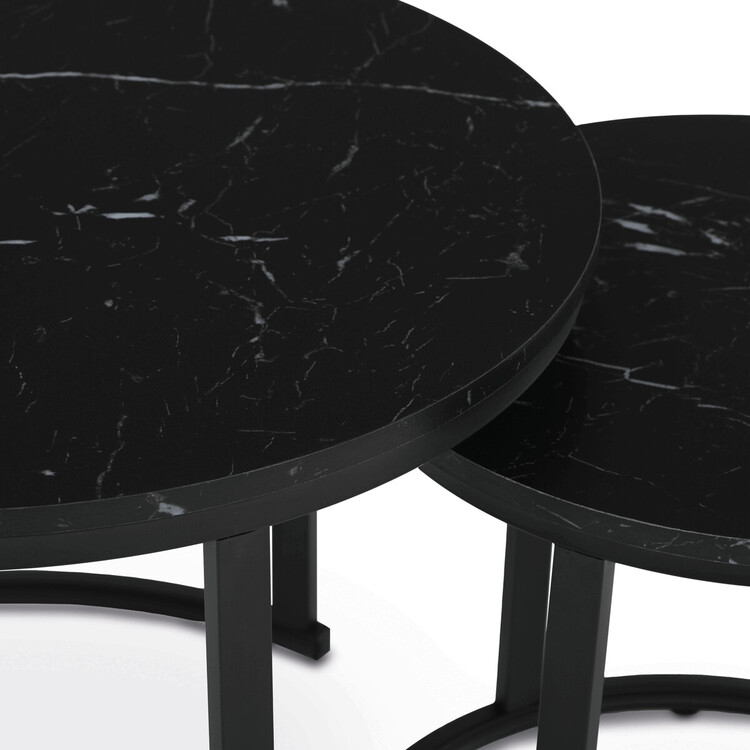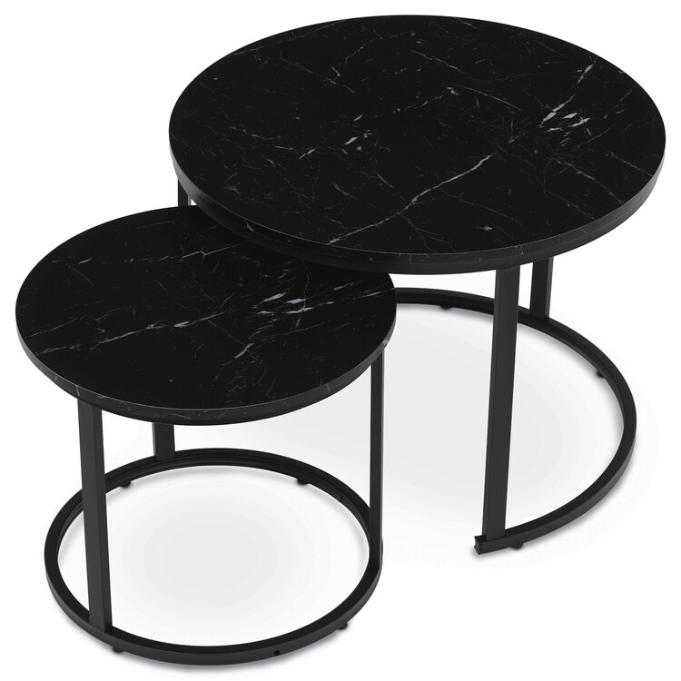 Set dvou konferenčních stolků s deskami z MDF v dekoru černého mramoru a matnou povrchovou úpravou nabízí moderní řešení pro obývací pokoj či kancelář. Kovová podnož v černém laku zajišťuje pevnou a stabilní oporu, zatímco kulatý tvar stolů přispívá k elegantnímu a vzdušnému vzhledu. Větší stolek dosahuje výšky 50 cm, menší je o něco nižší, což umožňuje jejich praktické skládání a variabilní uspořádání prostoru. Kombinace kvalitních materiálů a precizního zpracování zaručuje dlouhou životnost a snadnou údržbu. Tento set je vhodný pro moderní interiéry, kde oceníte funkčnost i design.