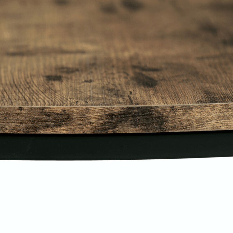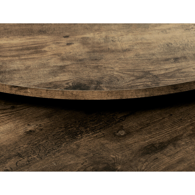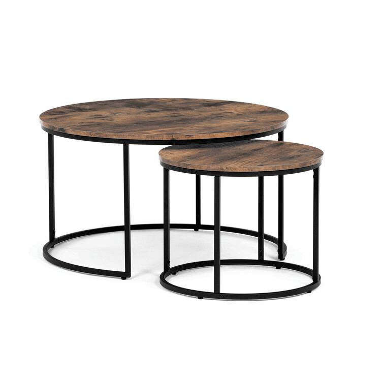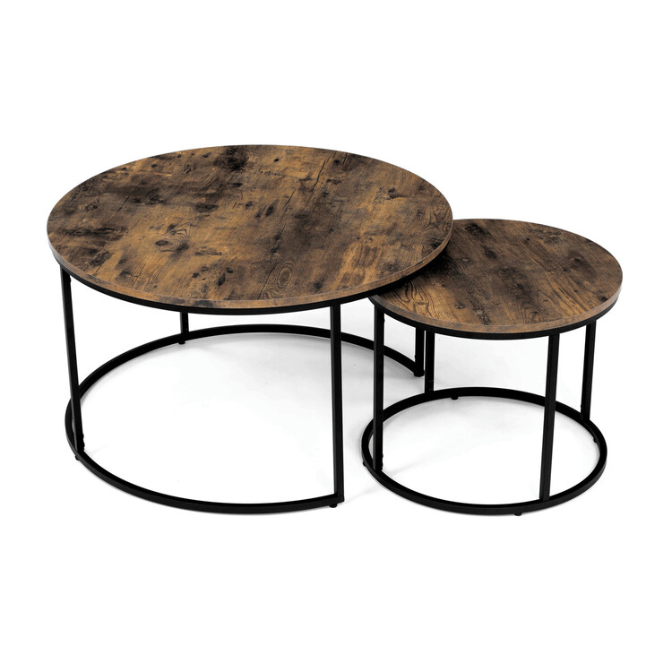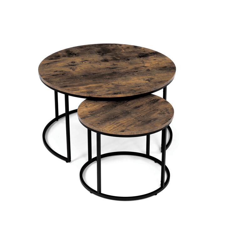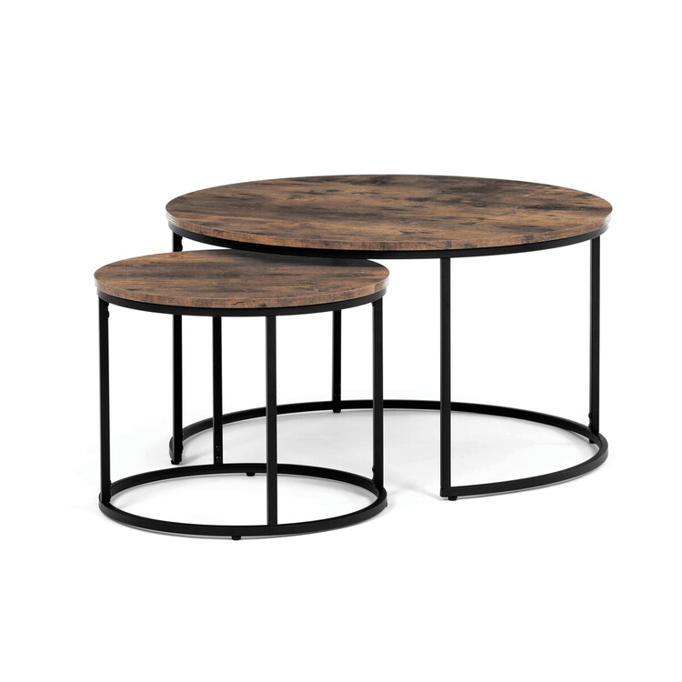 Set dvou konferenčních stolků kombinuje desky z MDF s dekorem starého dřeva a pevnou kovovou podnož v černém laku, která zajišťuje stabilitu a dlouhou životnost. Stolky mají kulatý tvar s hladce opracovanými hranami a rozdílnou výškou, což umožňuje jejich praktické uspořádání v prostoru, například zasunutí menšího stolku pod větší. Povrch desek je odolný vůči běžnému opotřebení a snadno se udržuje, což přispívá k jejich funkčnosti v moderních interiérech. Díky kombinaci přírodních odstínů hnědé a industriálního kovu se hodí do různých stylů zařízení od rustikálního po industriální. Rozměry a stabilní provedení umožňují využití stolů jako praktického doplňku obývacích pokojů či kanceláří.Menší stolek je s průměrem 50cm, výškou 40cm a světlou výškou 37cm.