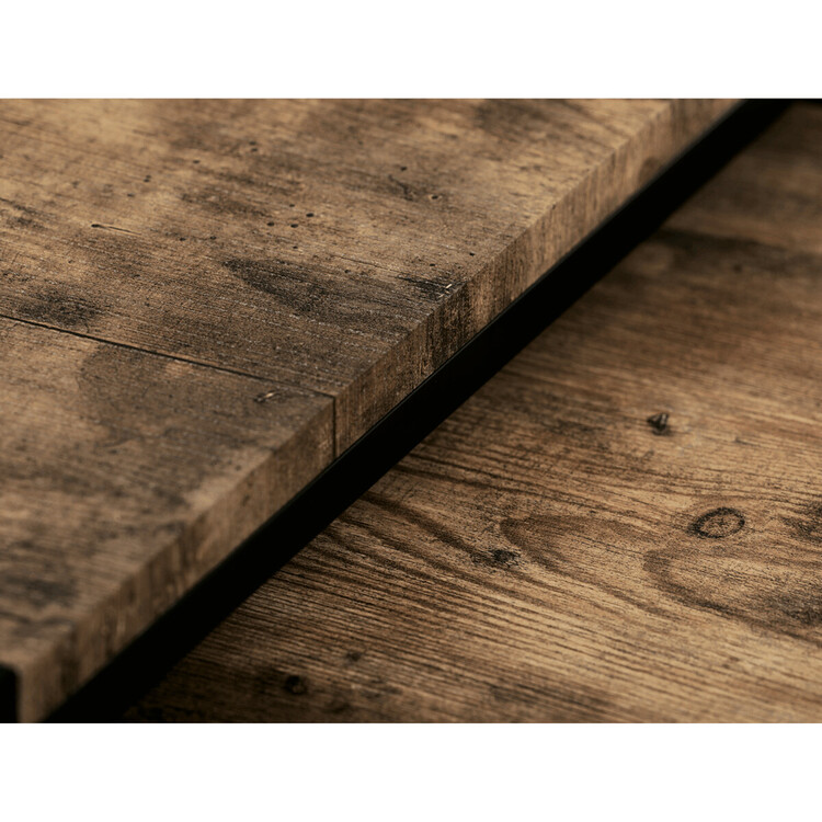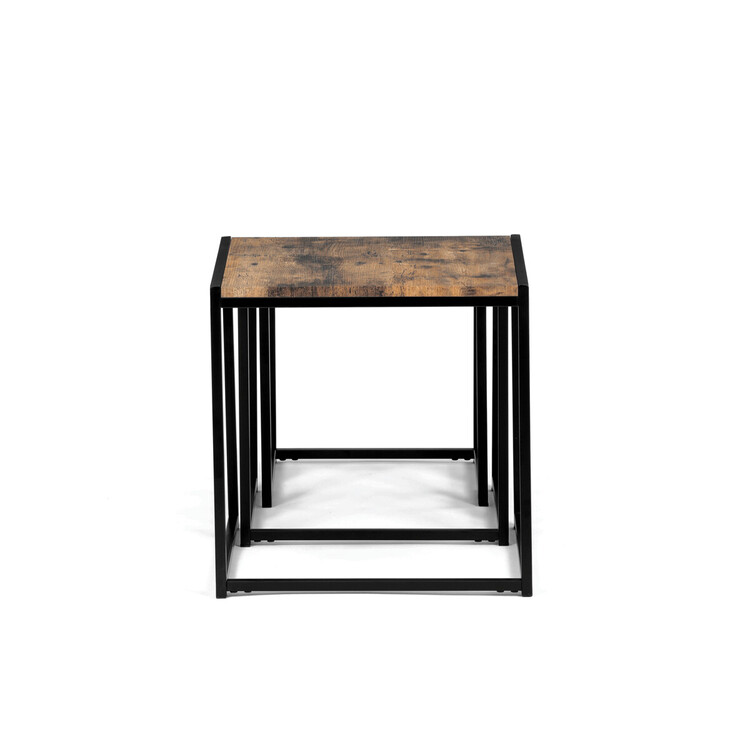 Set 3 ks přístavných nebo odkládacích stolků přinese do Vašeho domova praktičnost, variabilitu, ale také industriální šarm. Stolky můžete rozmístit jednotlivě po interiéru, kde Vám vytvoří zajímavé odkládací prvky v různých výškových hladinách. A nebo společně povytažené, kde vytvoříte velkou obdélníkovou stupňovitou odkládací plochu. Velkou výhodou je možnost zasunutí stolků do sebe, což oceníte při úklidu, skladování nebo při potřebě většího prostoru.Čtvercové desky z MDF v dekoru staré dřevo harmonicky doplňují černá kovová konstrukce, která tvoří rovněž nohy a celkově stolky zpevňuje. Stolek jistě zaujmou nejen svým nadčasovým designem, ale i variabilitou a praktičností.Desky májí rozměr 35 × 35 × 35 , 40 × 40 × 40 a 45 × 45 × 45 cm, tloušťku 1,5 cm. Konstrukce je čtvercového průřezu, na spodních plochách opatřená plastovými kluzáky. Nosnost jednotlivého stolku je do 15 kg.