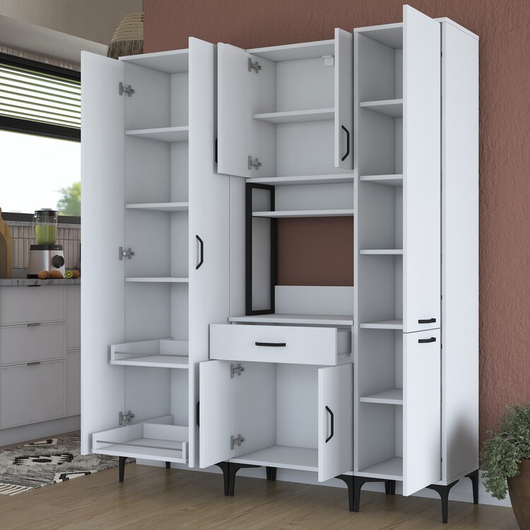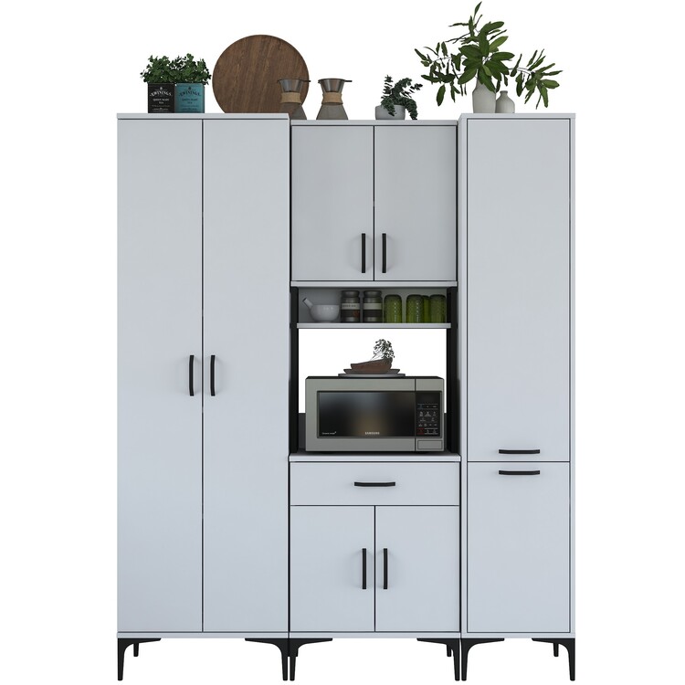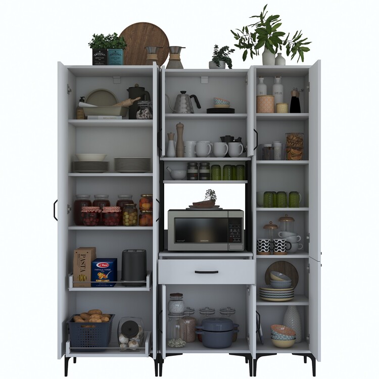 Skříň nabízí praktické uspořádání díky osmi plným dvířkům, jedné zásuvce a regálku, který je ideální pro umístění mikrovlnné trouby nebo jiných kuchyňských spotřebičů. Víceúčelový design poskytuje dostatek místa pro uložení nádobí, kuchyňských potřeb a dalších předmětů, které chcete mít po ruce.