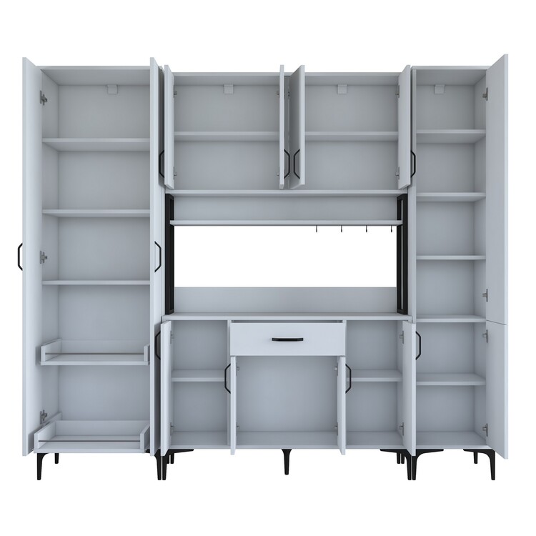 Skříň je navržena tak, aby poskytovala maximální úložný prostor. Obsahuje deset plných dvířek, jednu zásuvku a praktický regálek, který je ideální pro umístění mikrovlnné trouby nebo dalších kuchyňských spotřebičů. Její víceúčelový design vám umožní efektivně organizovat nádobí, kuchyňské potřeby i další příslušenství.